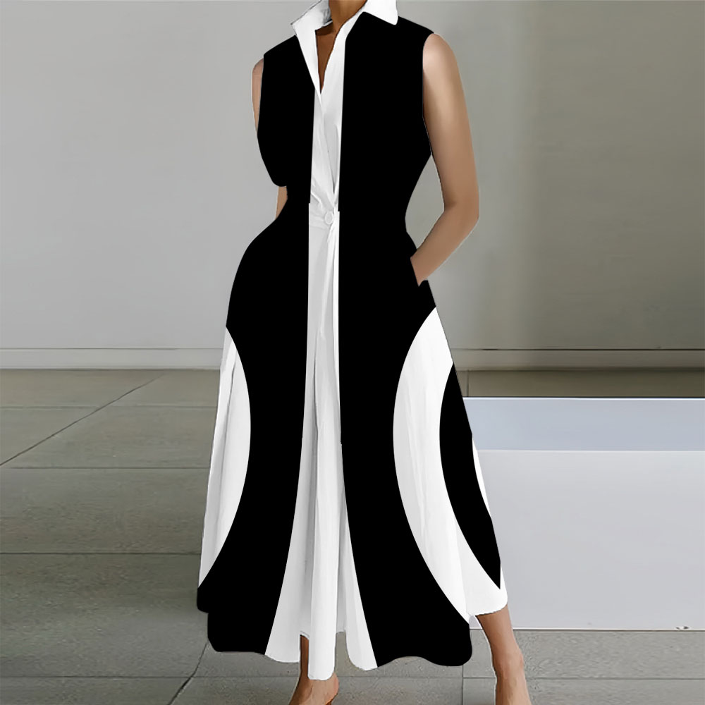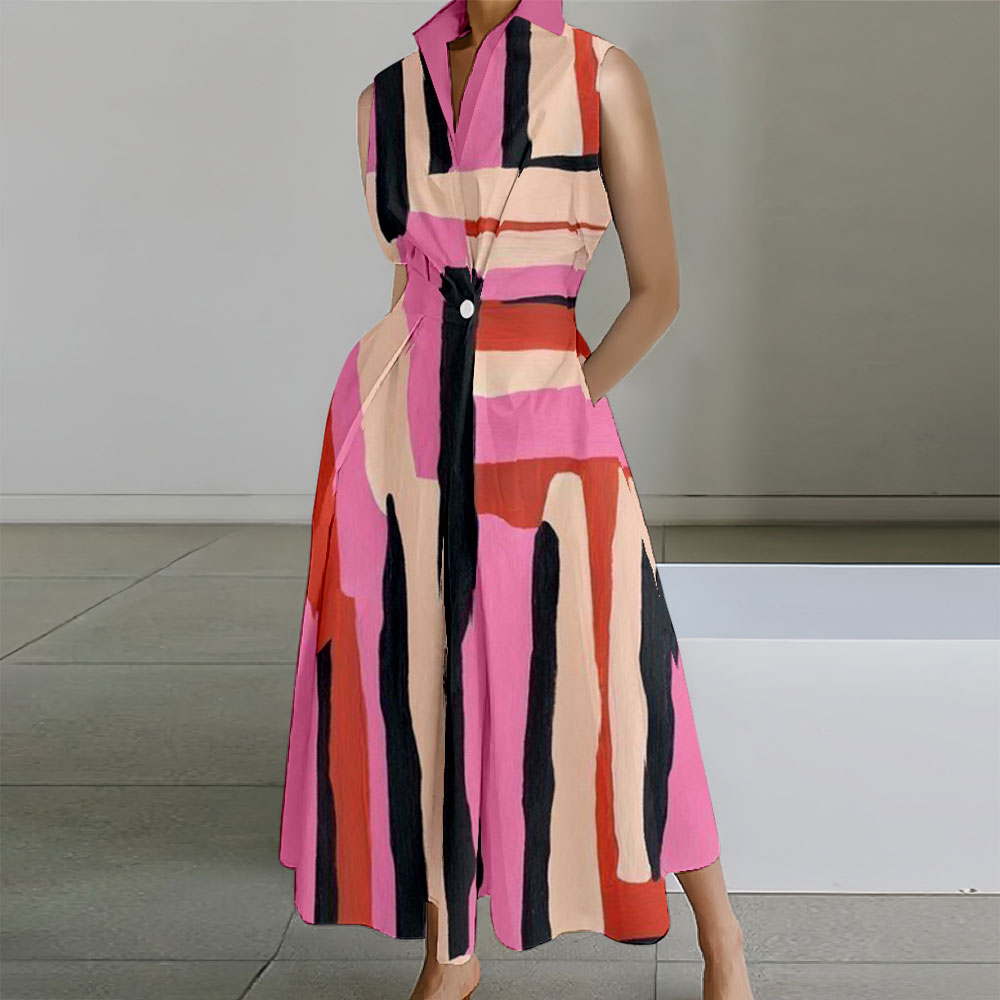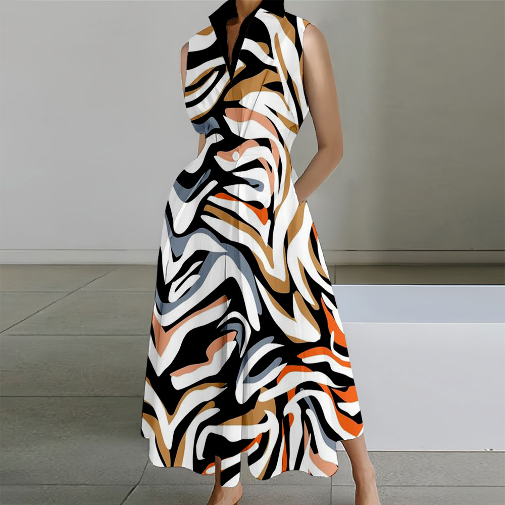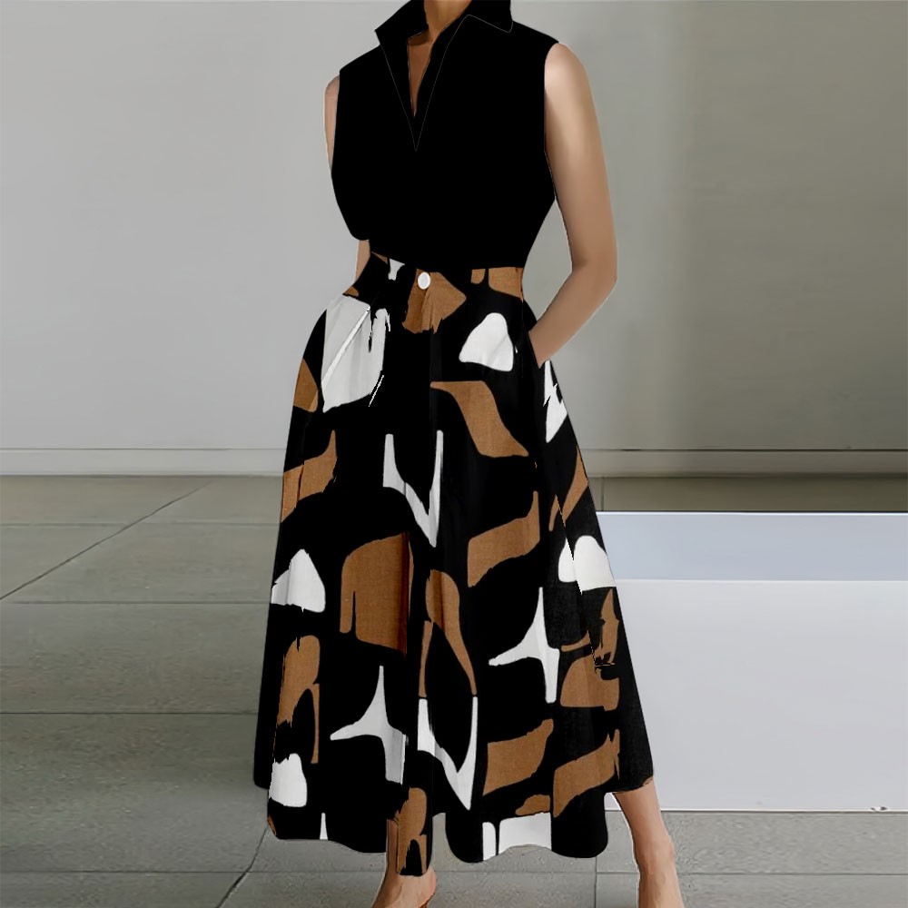 Geometric Printed Sleeveless Lapel Collar Pocket Maxi Dresses