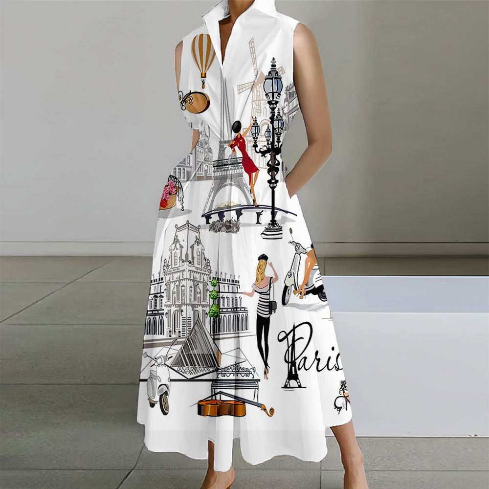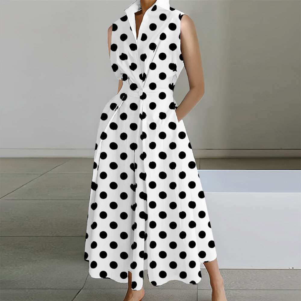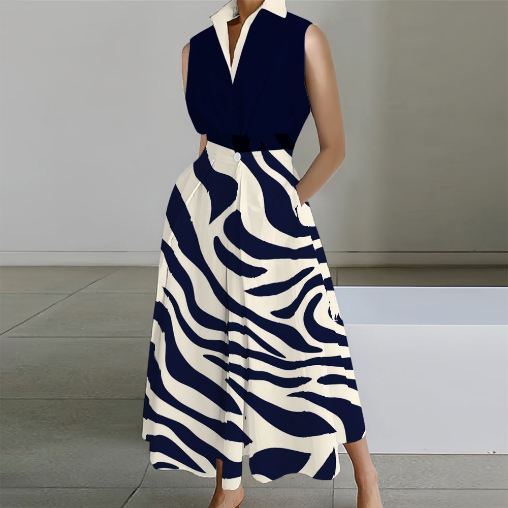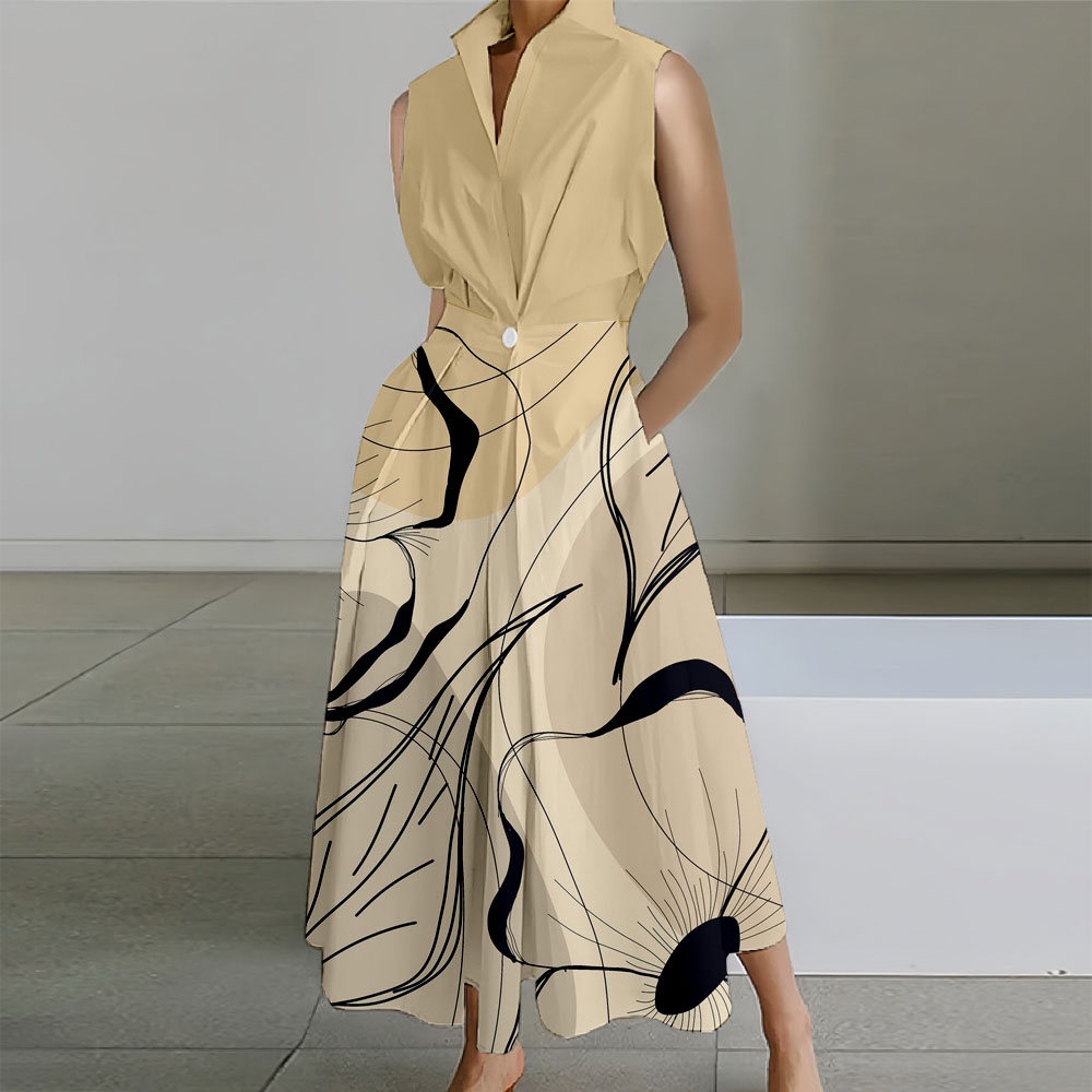 Geometric Printed Sleeveless Lapel Collar Pocket Maxi Dresses