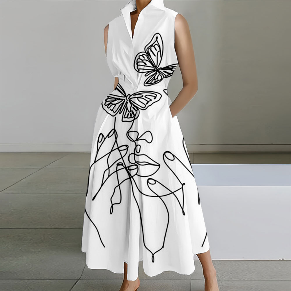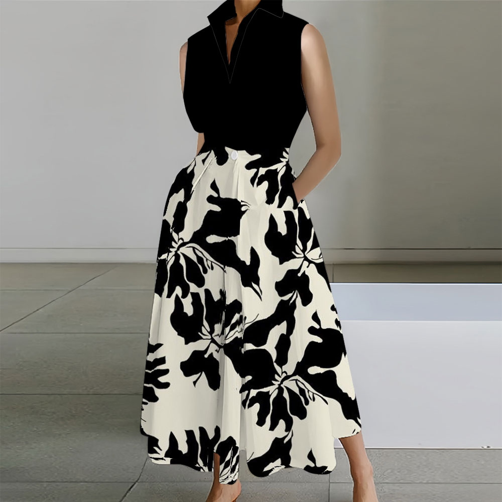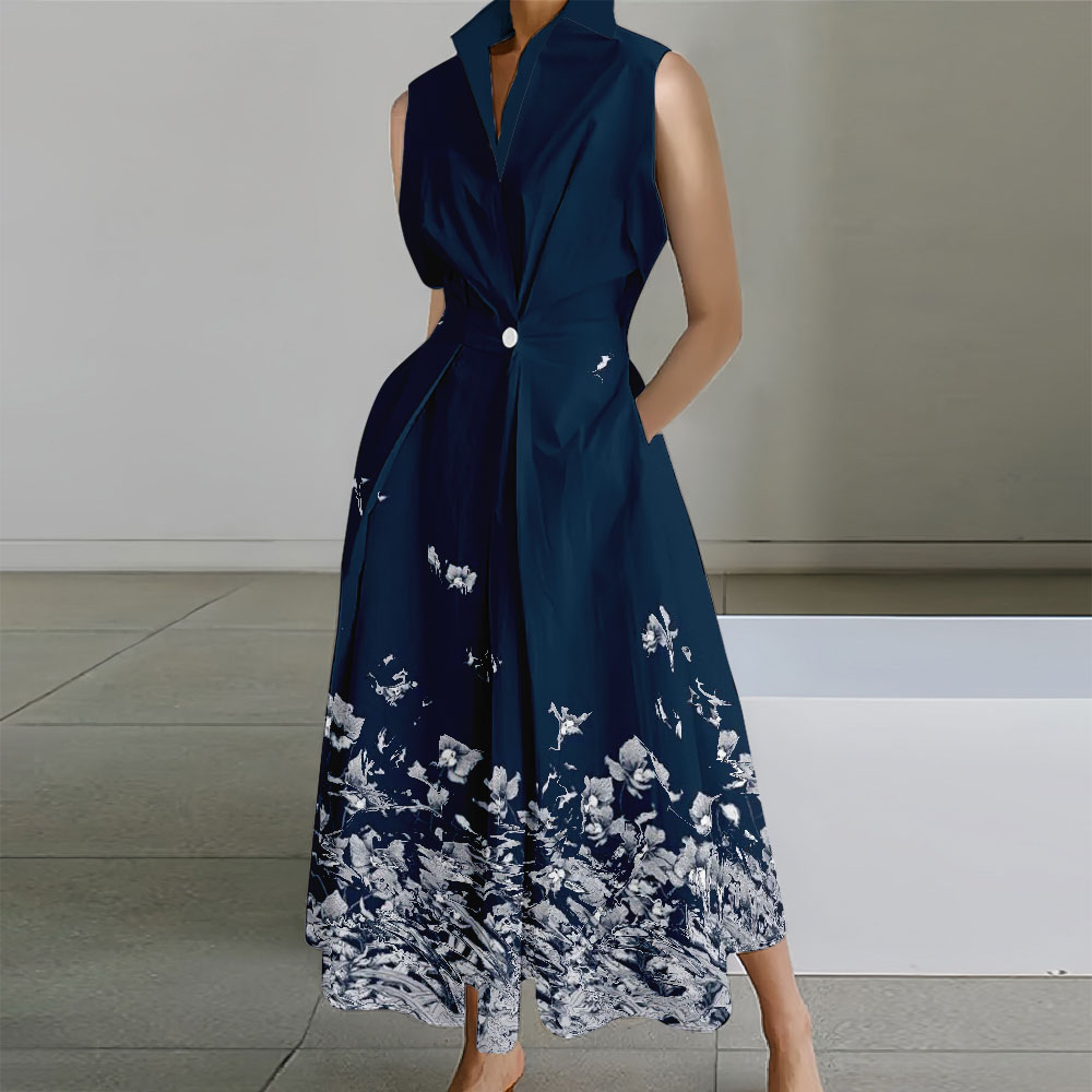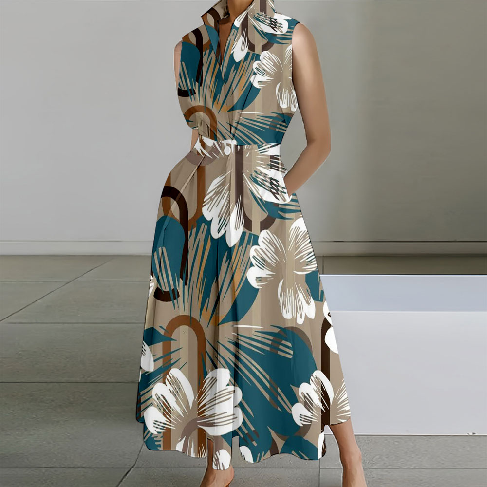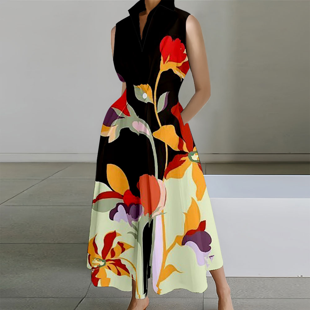Flower Printed Sleeveless Lapel Collar Pocket Maxi Dresses