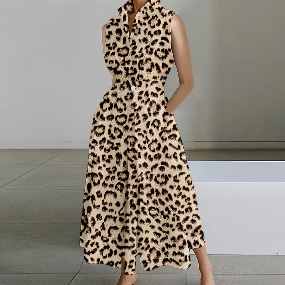Leopard Print Sleeveless Lapel Collar Pocket Maxi Dresses