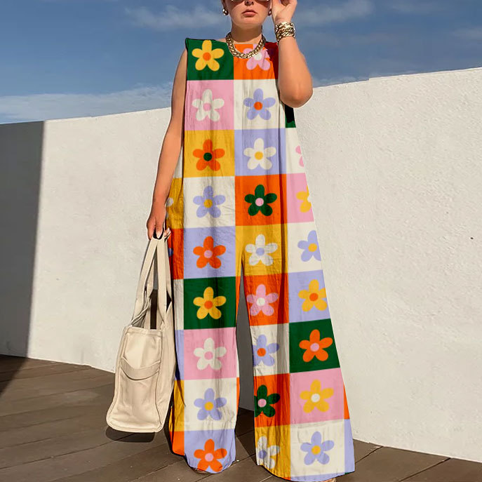 Sleeveless Wide Leg Shoulder Pad Printed Jumpsuits