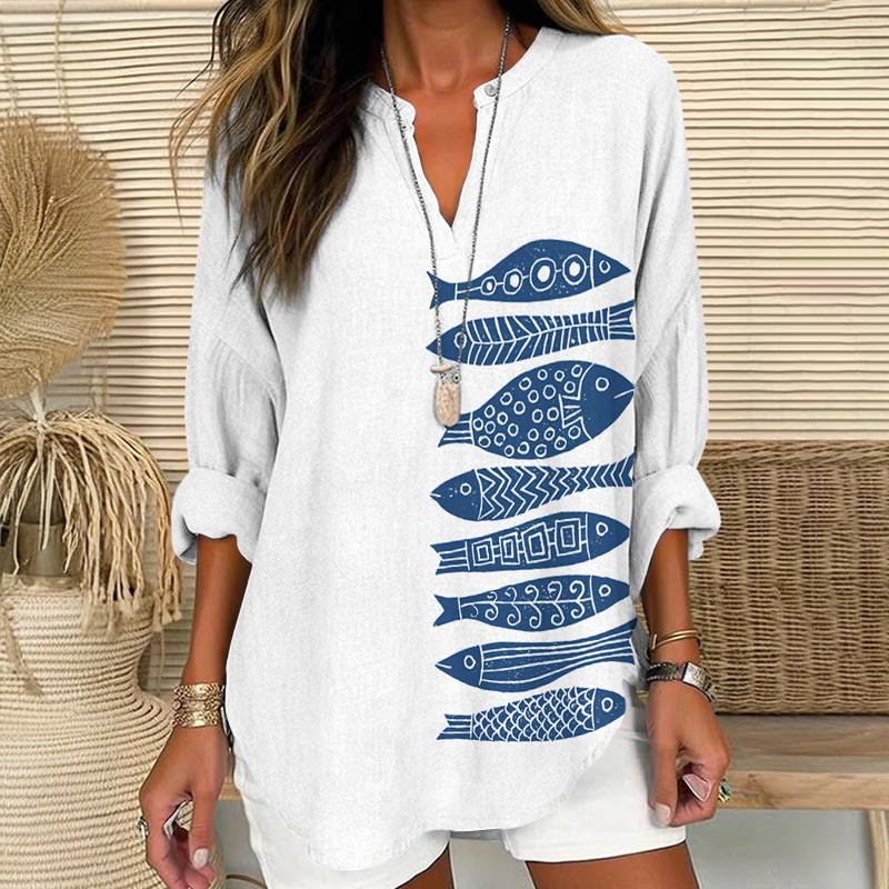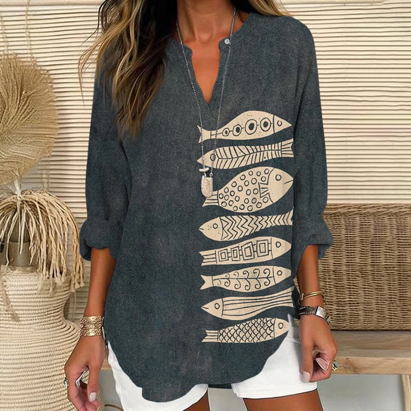 Dashingsoul Fish Japanese Lino Art Print V Neck Long Sleeve Blouse