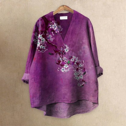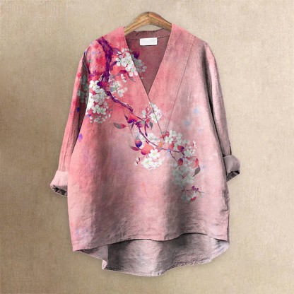 Japanese Antique Pear Blossom Ink Painting Printed Casual V-neck Blouse