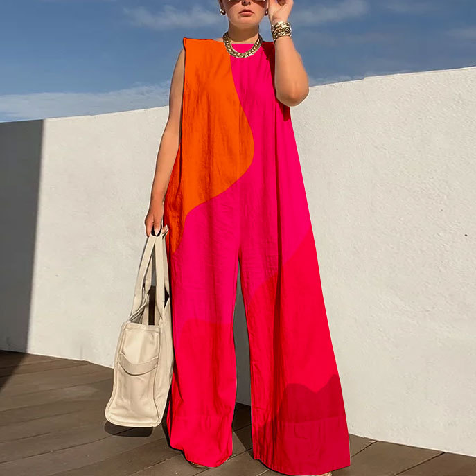 Sleeveless Wide Leg Shoulder Pad Printed Jumpsuits