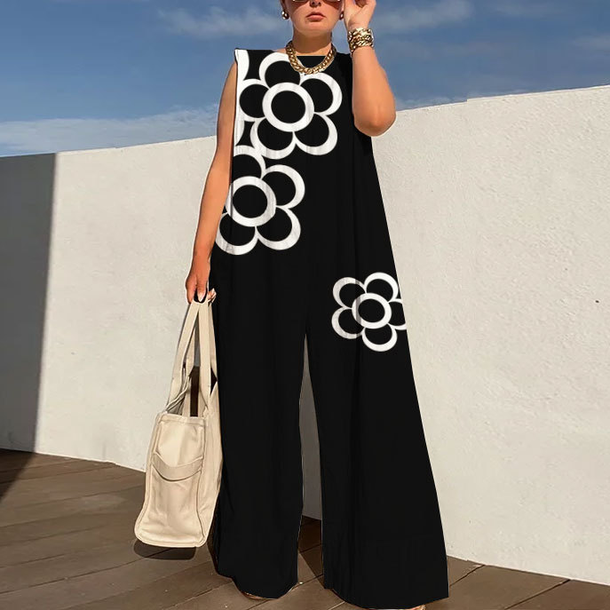 Sleeveless Wide Leg Shoulder Pad Printed Jumpsuits