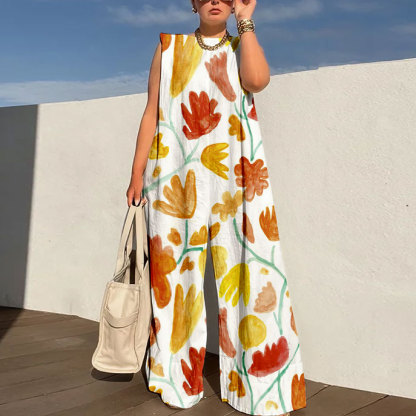 Sleeveless Wide Leg Shoulder Pad Printed Jumpsuits