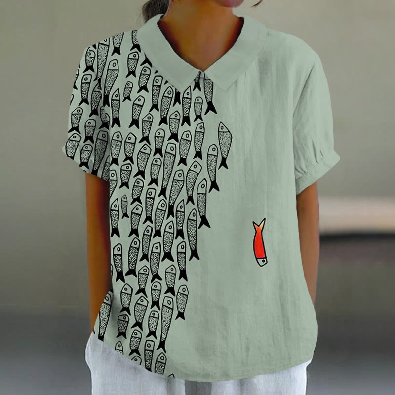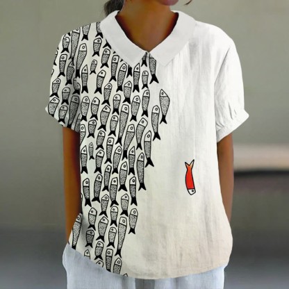 Dashingsoul Cute Simple Lines Abstract Geometric Fish Art Print Casual Lapel Loose Blouse