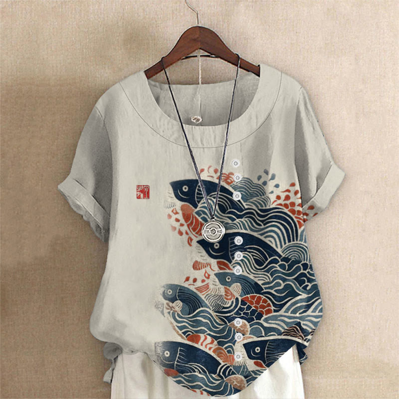 Dashingsoul Japanese Art Carp Print Blouse