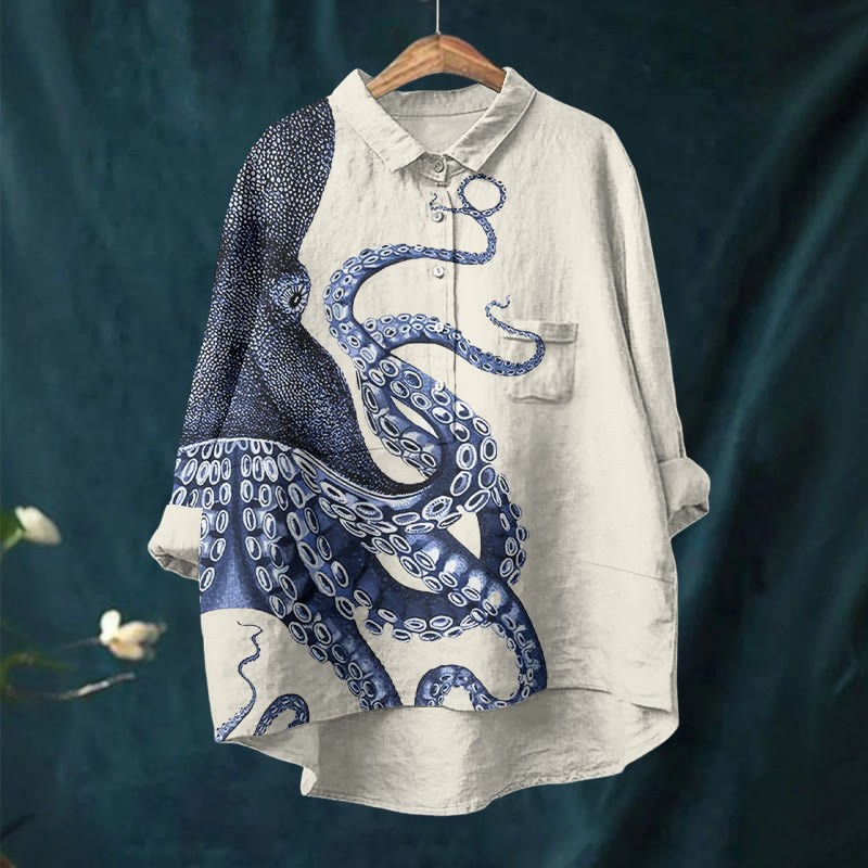 Dashingsoul Japanese Art Octopus Graphic Print Casual Lapel Blouse