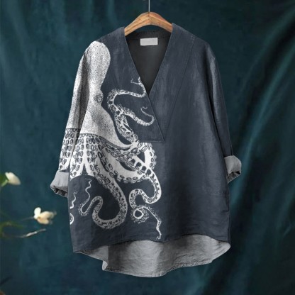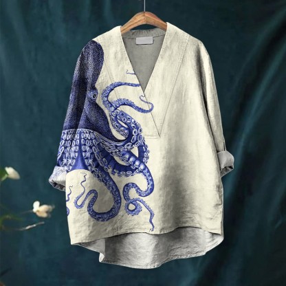 Japanese Art Octopus Graphic Print Casual V-neck Blouse