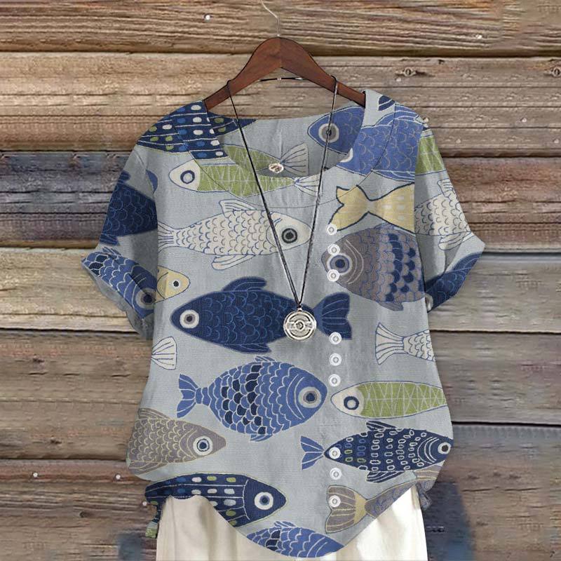 Dashingsoul Vintage Fish Japanese Art Print Short Sleeve Blouse