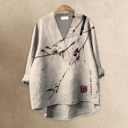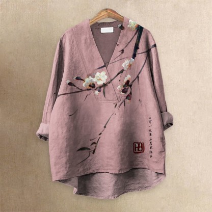 Vintage Plum Blossom Art Printed Casual V-neck Blouse