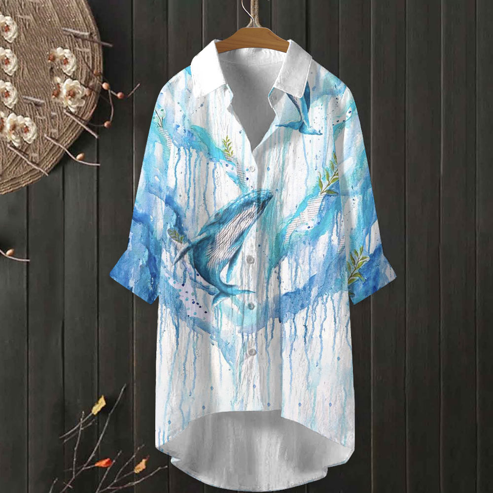 Dashingsoul Watercolor Whale Water Plant Print Casual Shirt