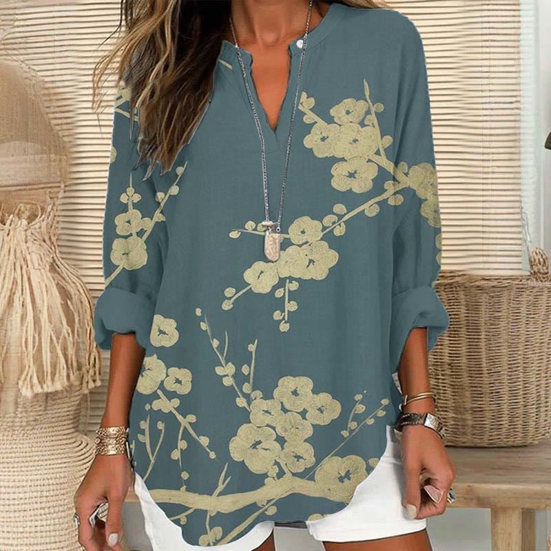 Dashingsoul Women's Japanese Floral Art V Neck Long Sleeve Blouse