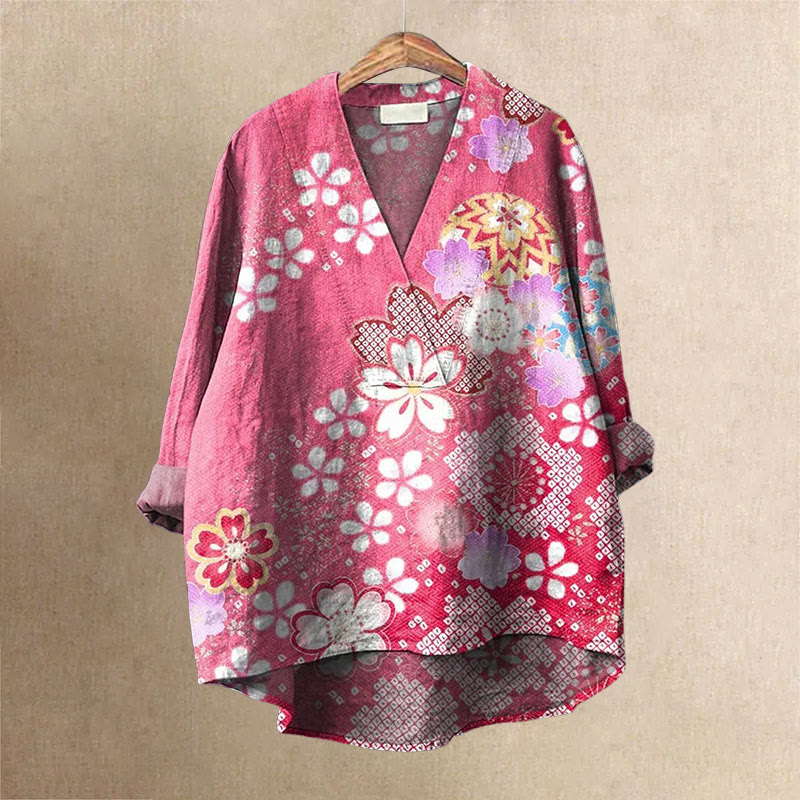 Dashingsoul Women's Japanese Art Plum Blossom Printed V Neck Long Sleeve Blouse