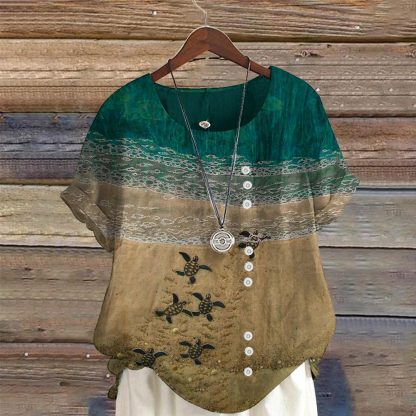Dashingsoul Baby Sea Turtles Beach Fiber Art Print Casual Short Sleeve Blouse