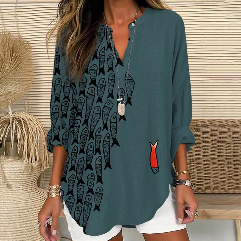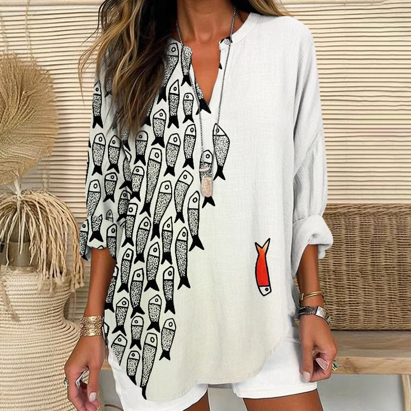 Dashingsoul Cute Simple Lines Abstract Geometric Fish Art Print V Neck Long Sleeve Blouse