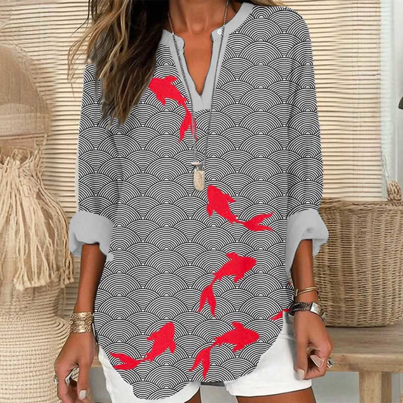Dashingsoul Japanese Goldfish Art Print V Neck Long Sleeve Blouse