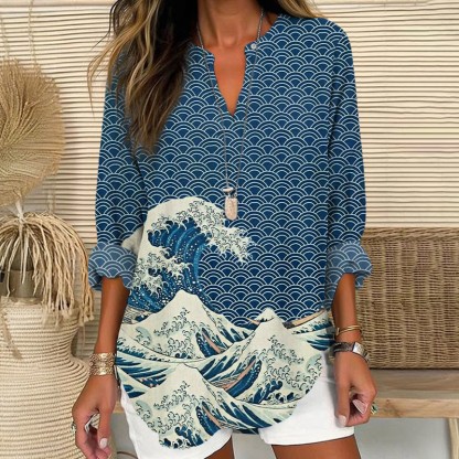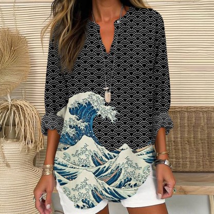 Dashingsoul The Great Wave Off Kanagawa Inspired Japanese Art Print V Neck Long Sleeve Blouse