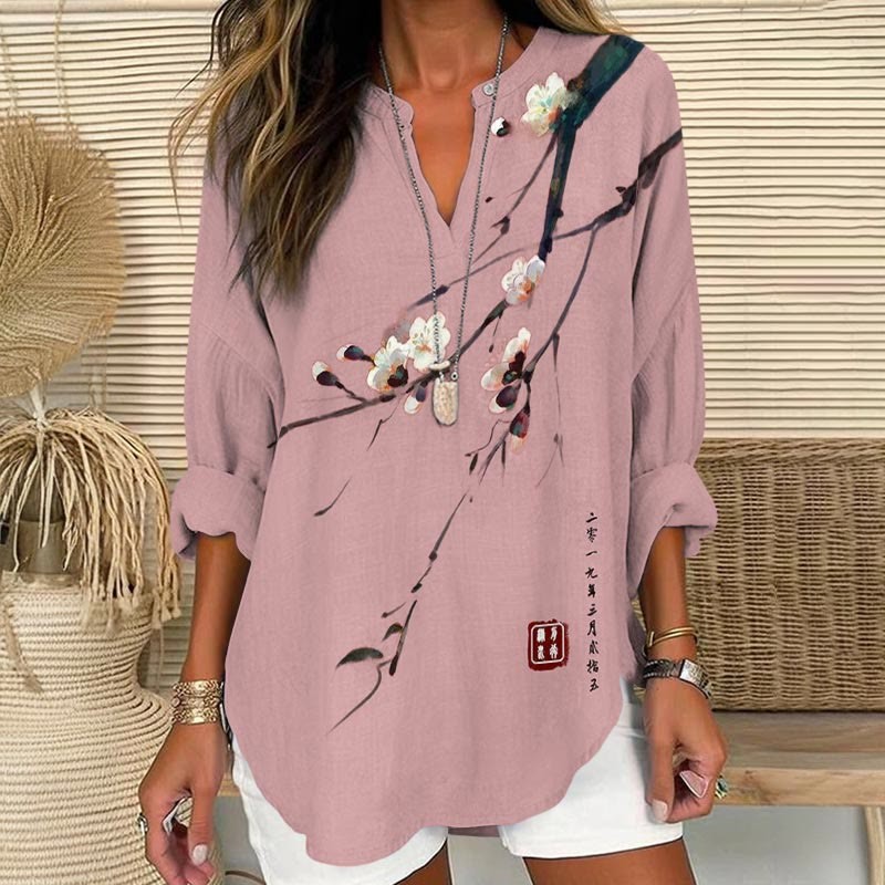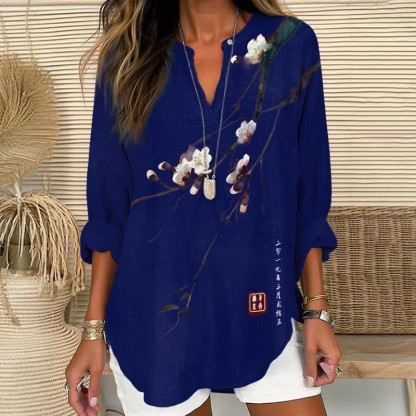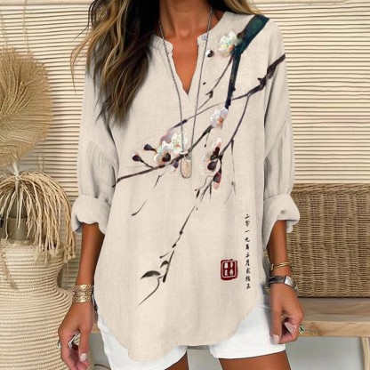 Dashingsoul Vintage Plum Blossom Art Print V Neck Long Sleeve Blouse