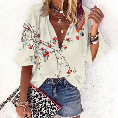 Dashingsoul Women's Japanese Art Floral Vintage Print Casual 3/4 Sleeve Blouse