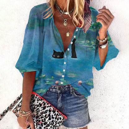 Dashingsoul Women's Oil Painting Cat Print Casual 3/4 Sleeve Blouse