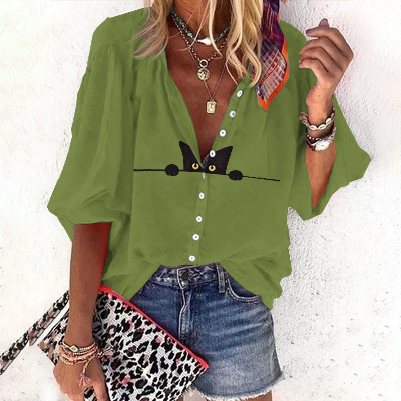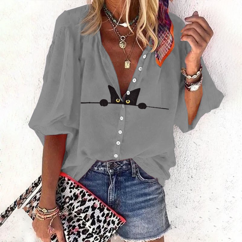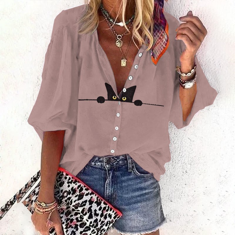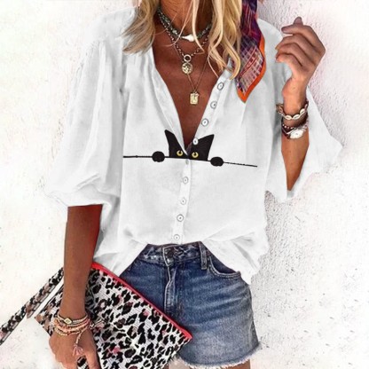 Dashingsoul Casual Black Cat Print Women's Casual 3/4 Sleeve Blouse