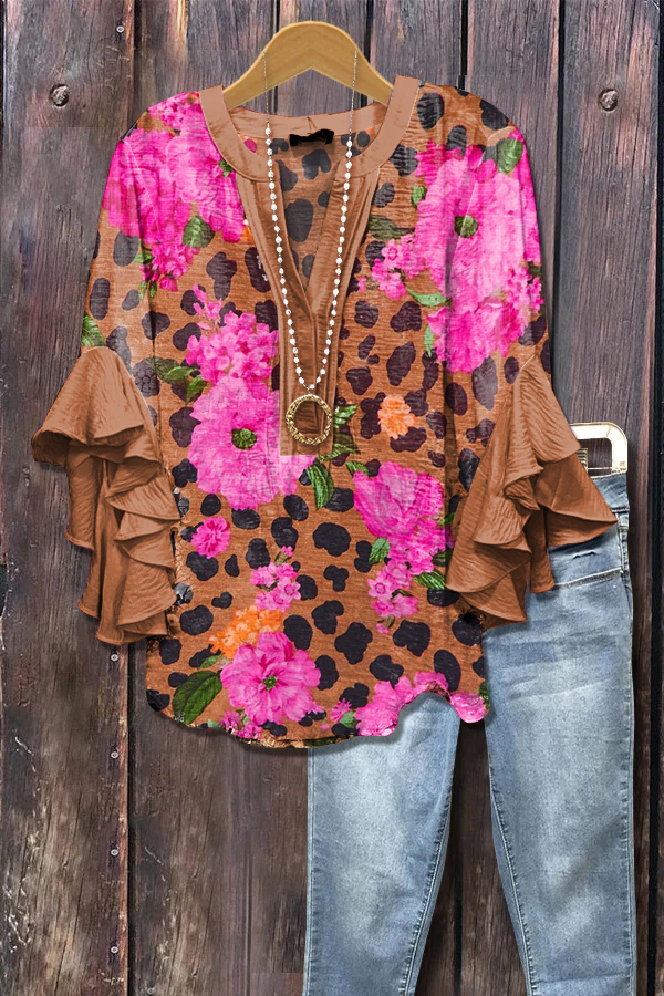 Elegant Leopard Floral Print Ruffle Sleeve Top
