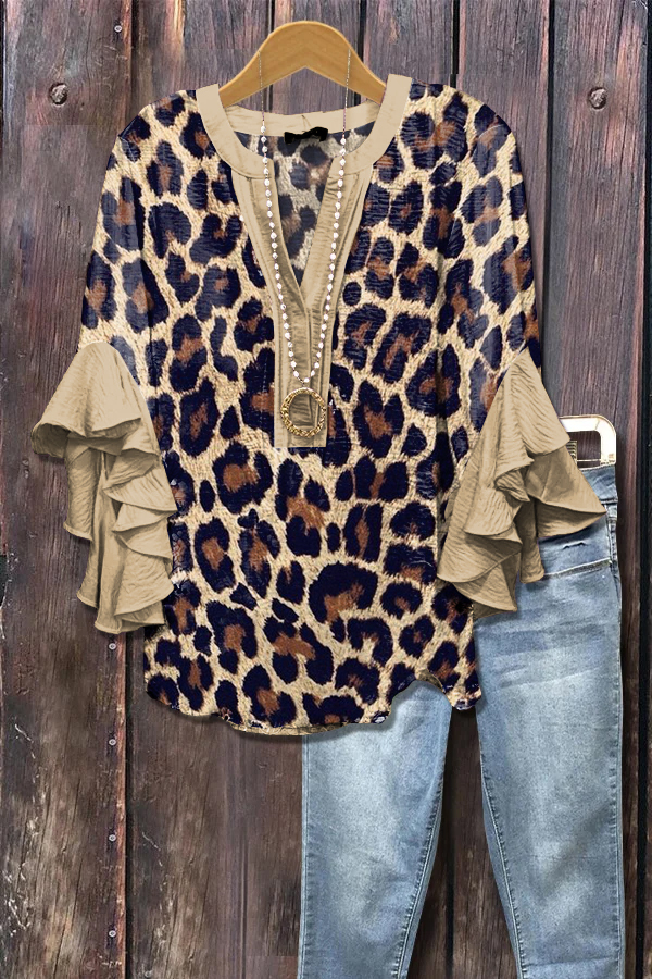 Elegant Leopard Print Ruffle Sleeve Top