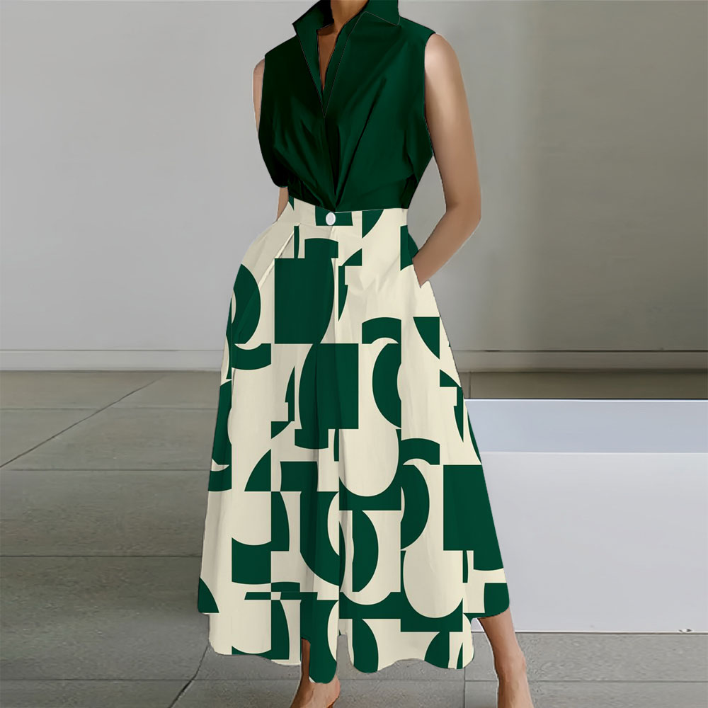 Flower Printed Sleeveless Lapel Collar Pocket Maxi Dresses