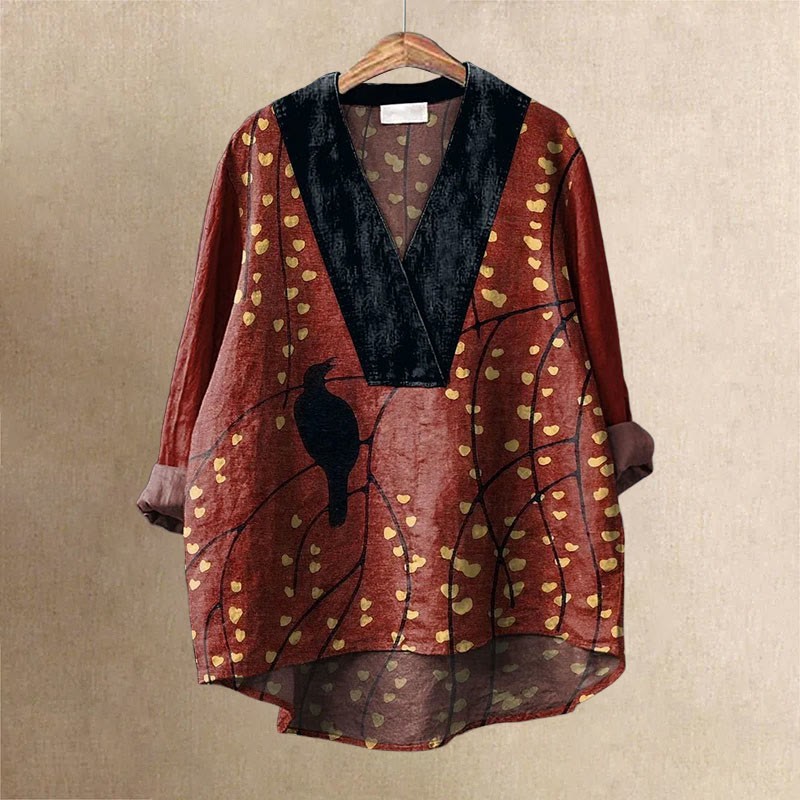 Japanese Style Flower Branch And Black Bird Printed Casual V-neck Shirt