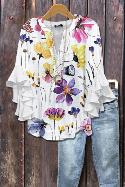 Wildflower Print V-Neck Ruffle Sleeve Top