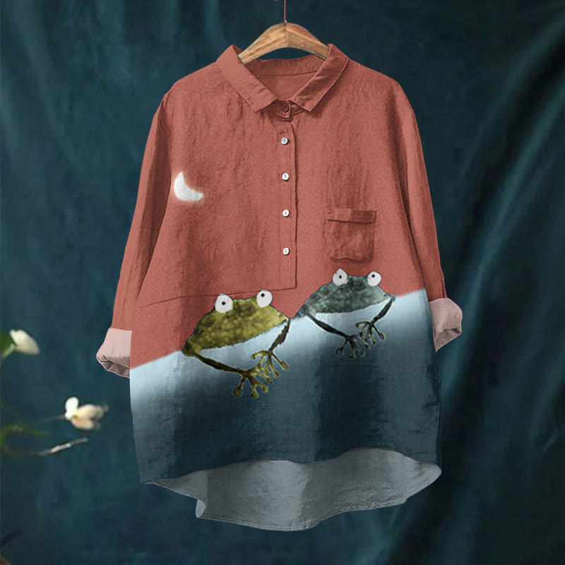 Dashingsoul Women's Simple Frog Color Block Art Print Casual Lapel Blouse