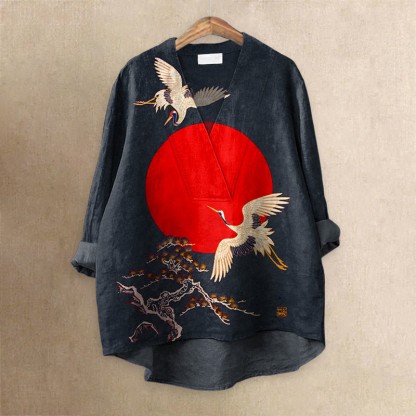 Cranes & Sunrise Japanese Art Vintage Printed Casual V-neck Blouse