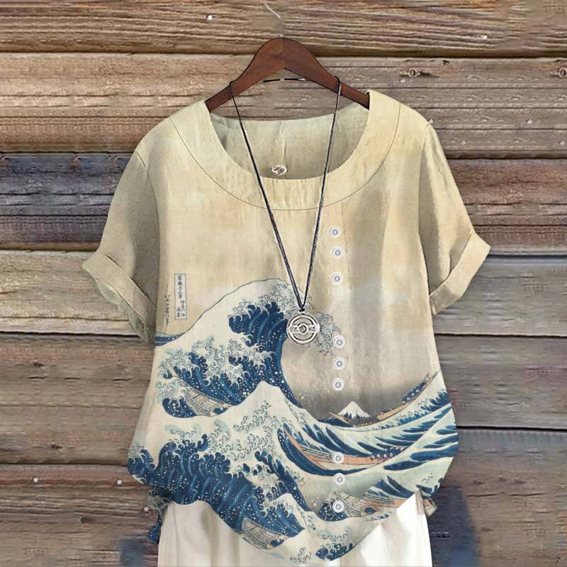 Dashingsoul Vintage The Great Wave Off Kanagawa Print Short Sleeve Blouse