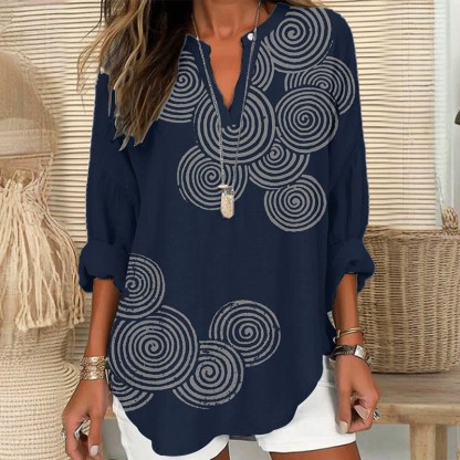 Dashingsoul Women's Simple Fingerprint Shape Art Print V Neck Long Sleeve Blouse