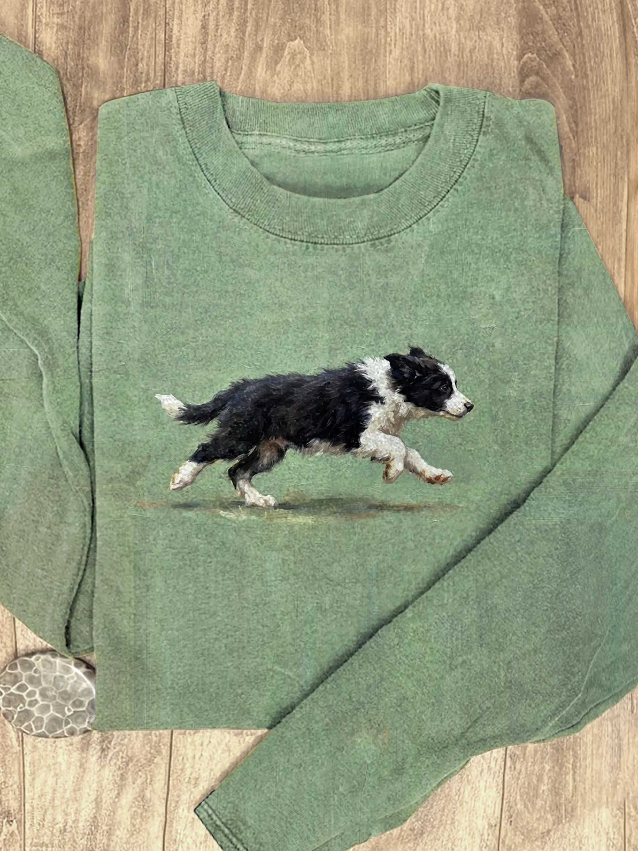 Funny Cute Running Border Collie Puppy Art Print Casaul Cotton Long Sleeve Shirt
