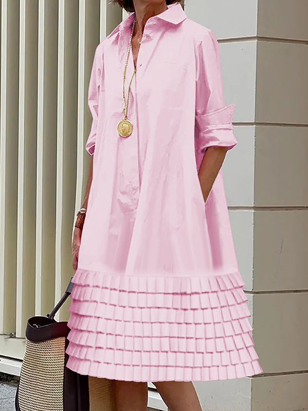 A-Line Long Sleeves Layered Pleated Pockets Solid Color Split-Joint Lapel Midi Dresses Shirt Dress