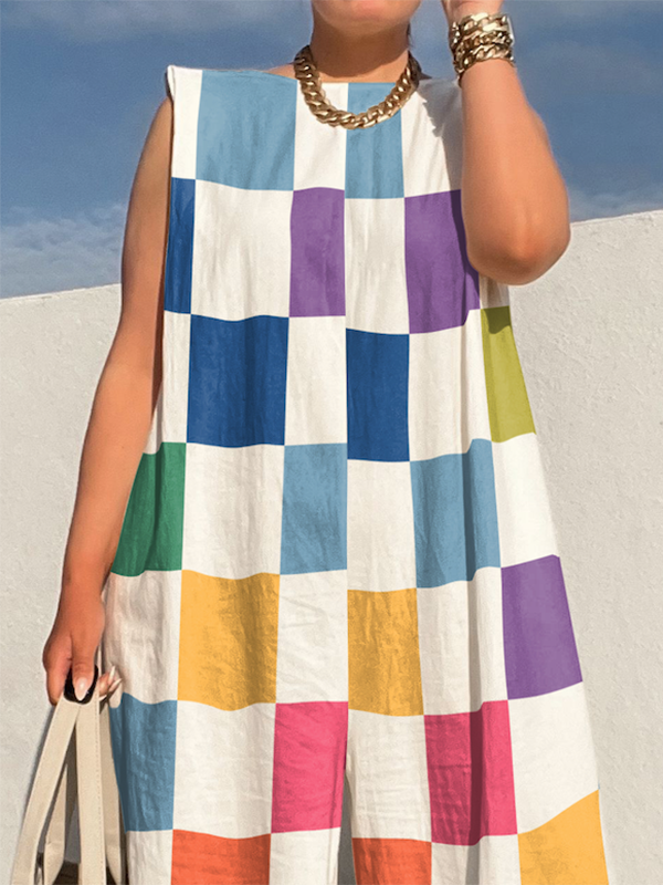 Loose Sleeveless Contrast Color Plaid Shoulder Pad Jumpsuits