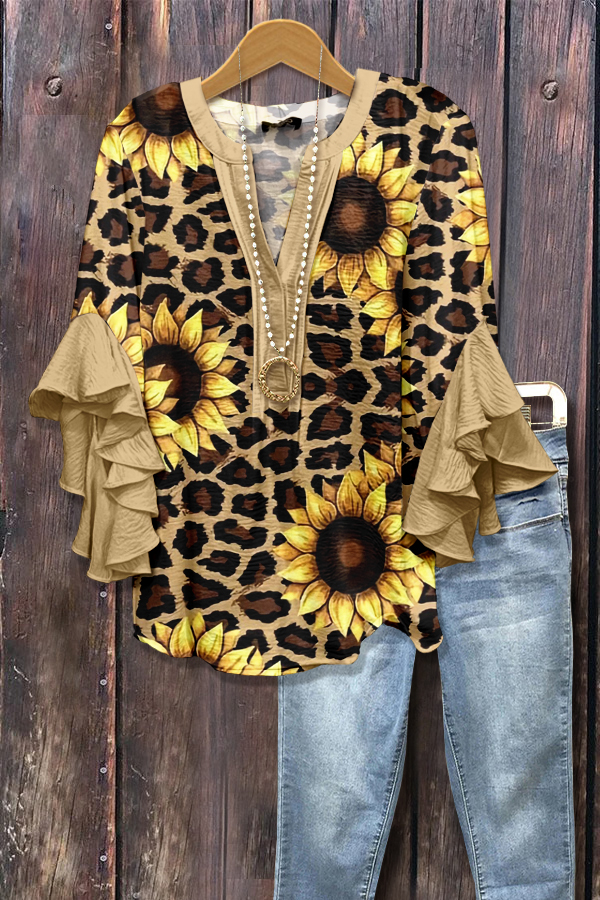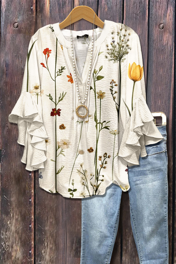 Elegant Tulip Floral Print Ruffle Sleeve Top