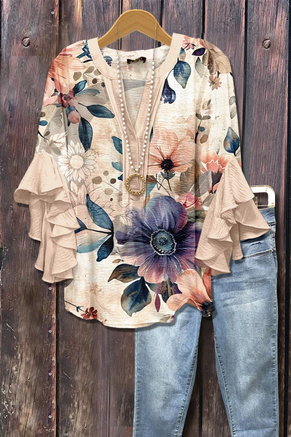 Art Floral Print Ruffle Sleeve Top