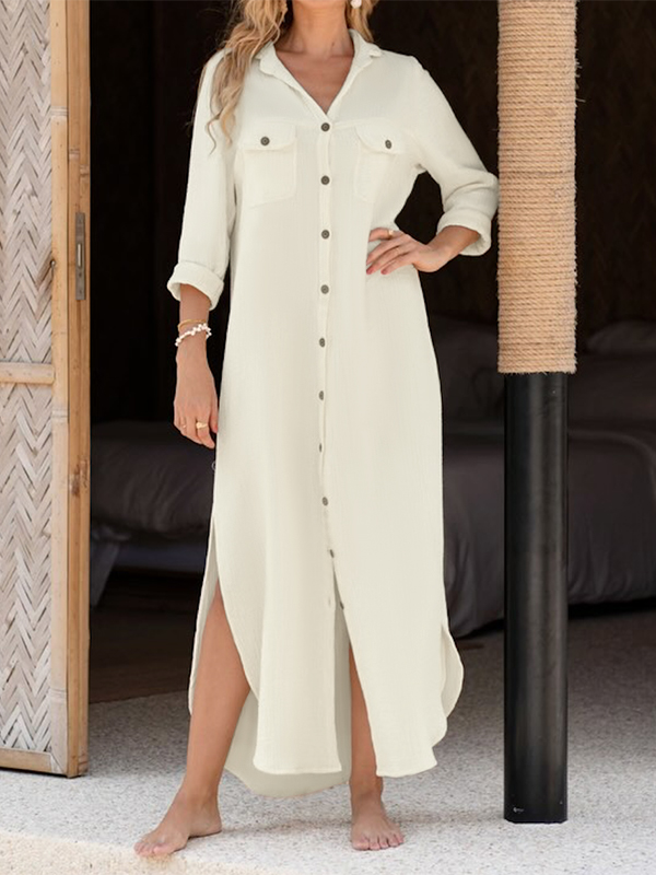 Long Sleeves Loose Buttoned Solid Color Split-Side Lapel Maxi Shirt Dress