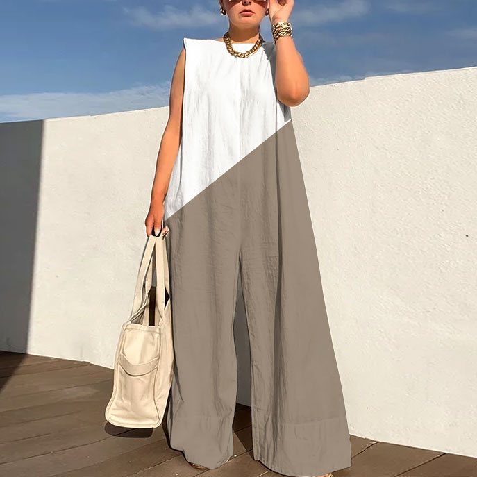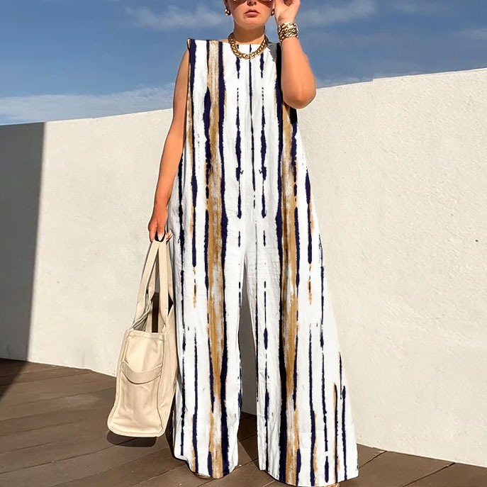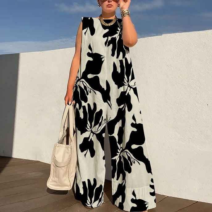 Sleeveless Wide Leg Shoulder Pad Printed Jumpsuits