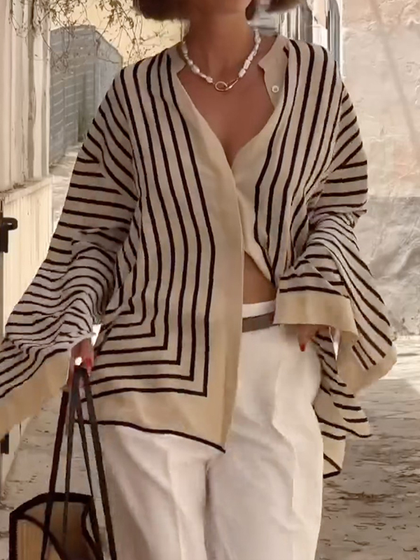 Long Sleeves Loose Buttoned Striped Stand Collar Blouses&Shirts Tops