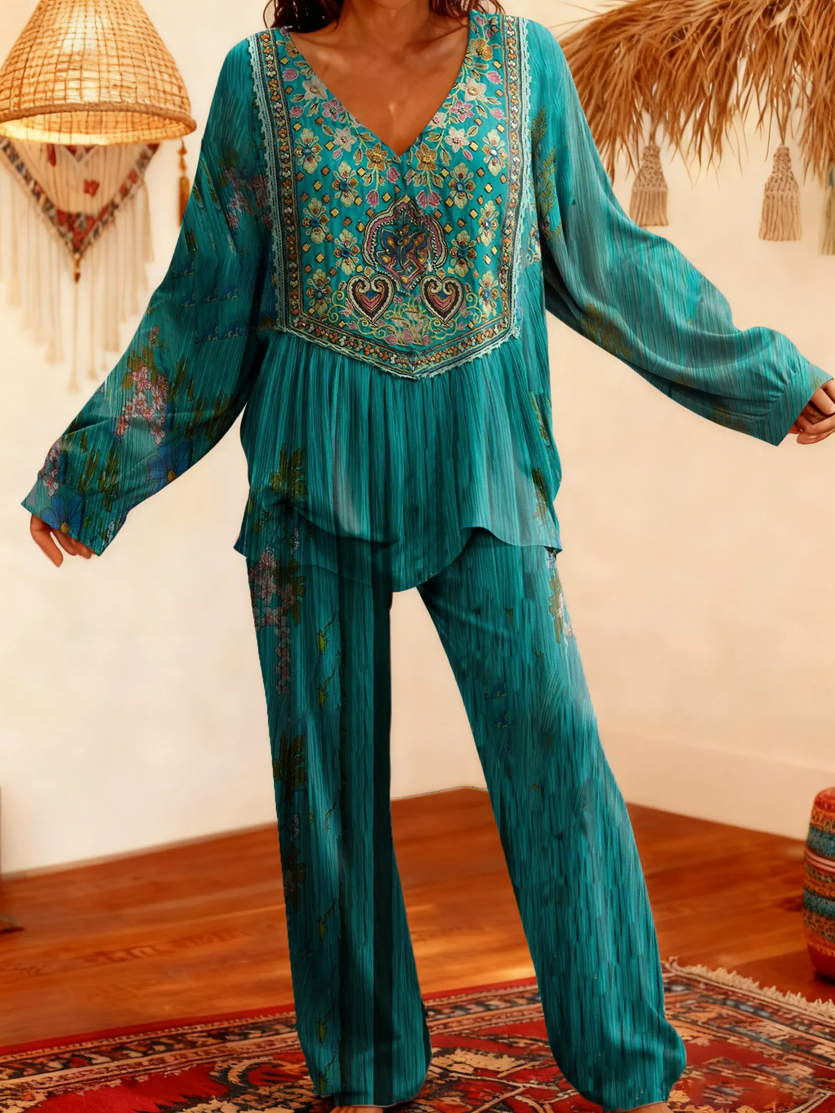 Women's Vintage Ethnic Floral Pattern Art Print Pajama Set