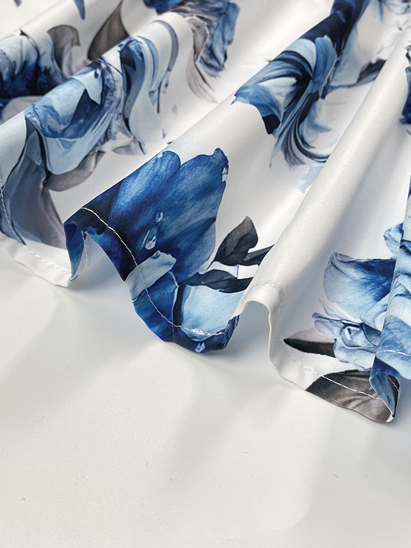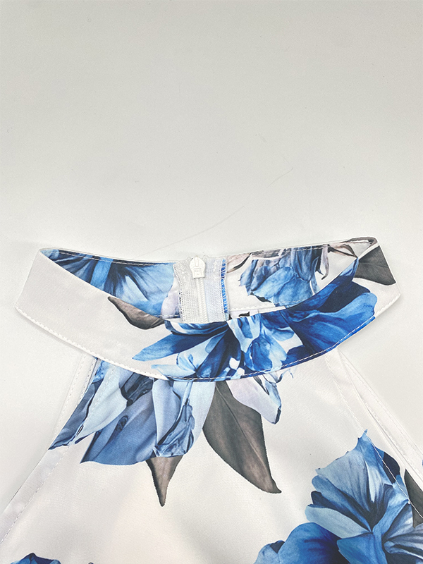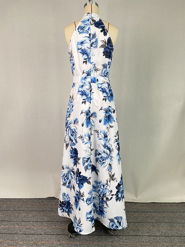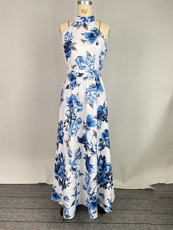 A-Line High Waisted Contrast Color Flower Print Pleated Halter-Neck Maxi Dresses