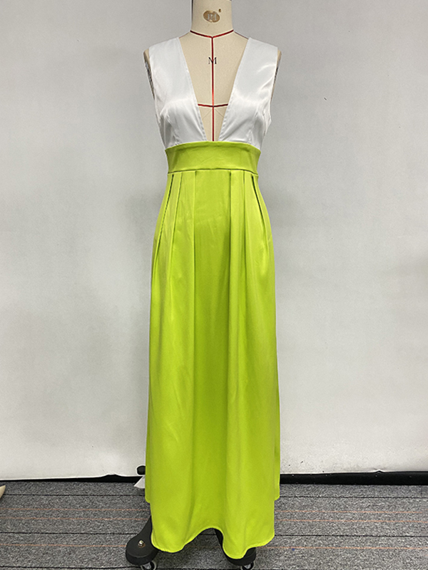 A-Line High Waisted Contrast Color Pleated Zipper Deep V-Neck Maxi Dresses