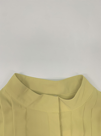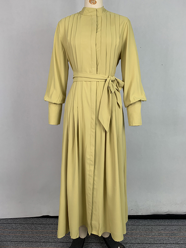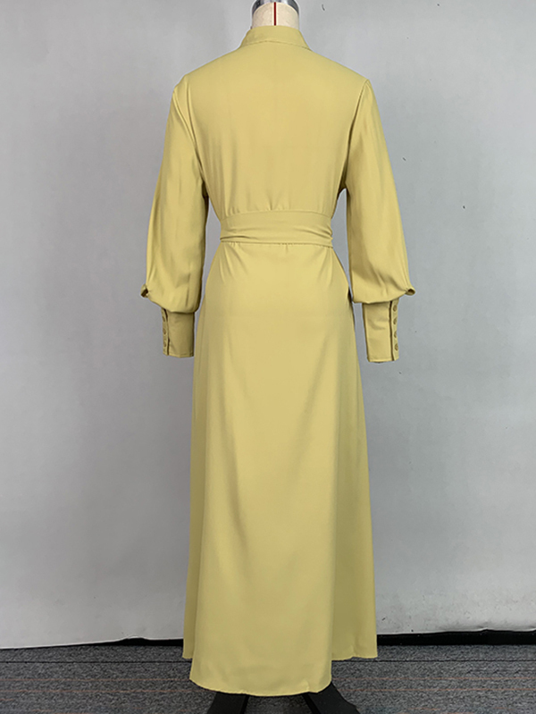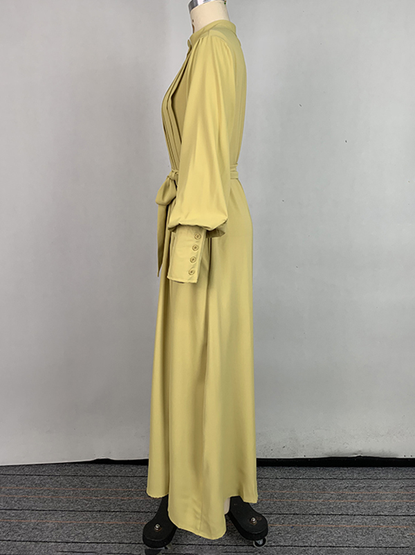 A-Line Long Sleeves Buttoned Pleated Pockets Solid Color Tied Waist V-Neck Maxi Dresses