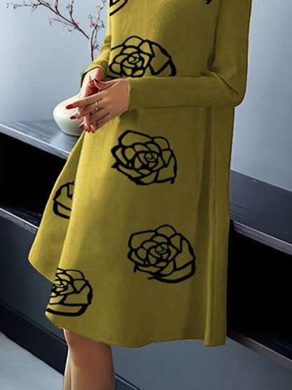 A-Line Long Sleeves Flower Print Mock Neck Midi Dresses
