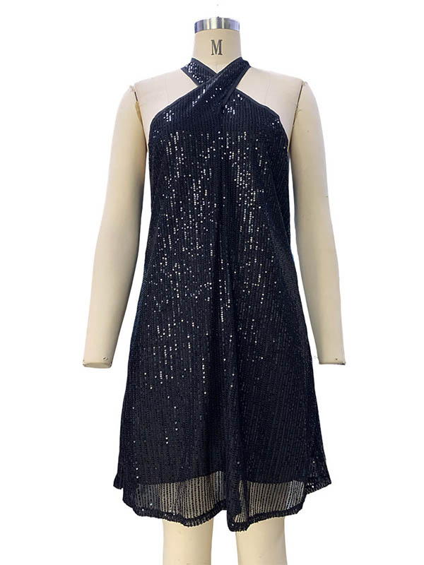 A-Line Loose Hollow Sequined Solid Color Halter-Neck Mini Dresses